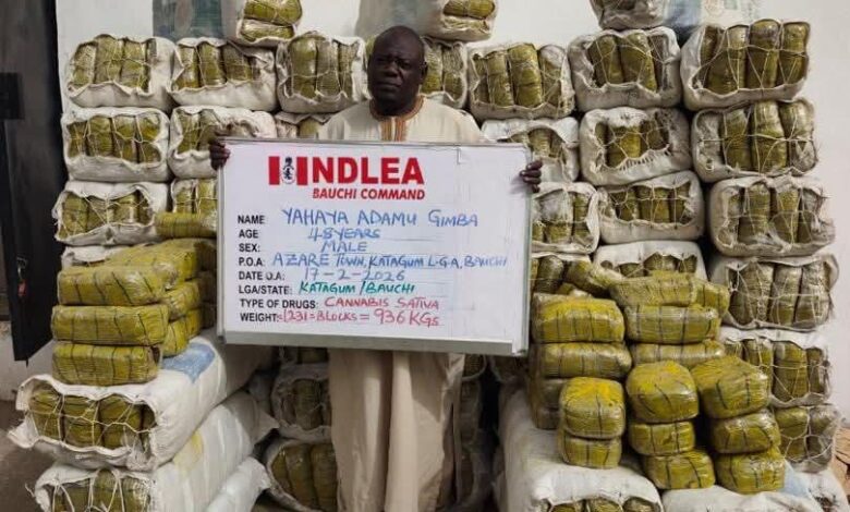 A total of 936 kilograms of skunk were seized from a suspect, Yahaya Adamu Gimba, 48, when he was arrested at Azare town, Katagun LGA, Bauchi on Tuesday 17th February, while another 85.8kg of same substance was recovered from Yahaya Adamu Gimba; Nasiru Suleman, 36; Abdul Umar, 25, and Musa Suleman, 21 in Azare.